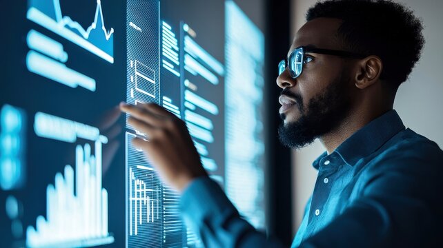 Business professional in a modern office environment analyzing data trends while standing confidently next to dynamic visual displays presenting global statistics