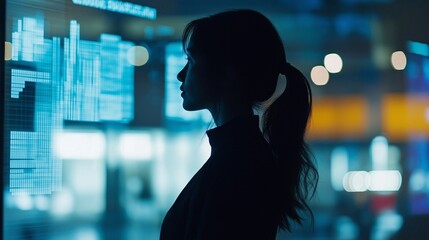 Focused and determined, a business woman stands in profile as she presents insights from data projections