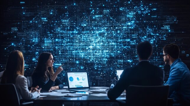 A team discusses data analysis in a high-tech meeting room illuminated by digital screens and projections.