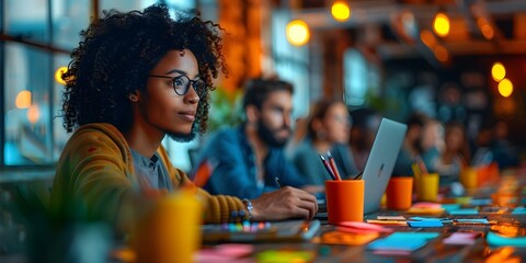 Diverse team brainstorming in creative office environment