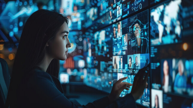 Social media command center, buzzing team monitoring trends and analytics, interactive screens