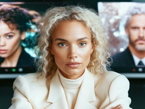 Diverse team collaborating in bright modern office on video call