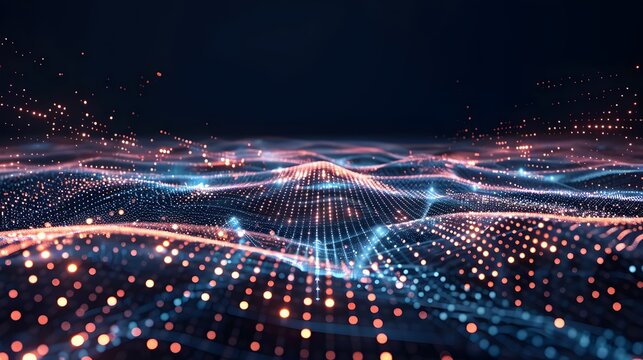 Abstract technology background illustration of a city at night, featuring light trails and wireframe hill in 3D rendering.