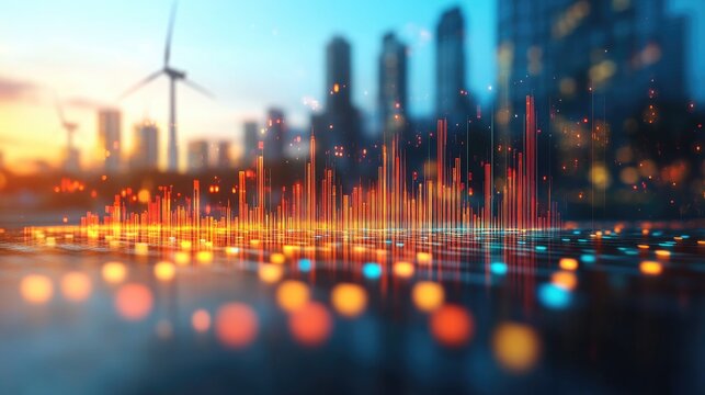 Vibrant city skyline at night with pulsating sound wave patterns and digital effects