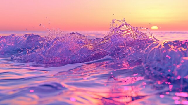 Vibrant sunset over ocean wave with splashing water droplets, Vibrant sunset hues paint ocean wave.