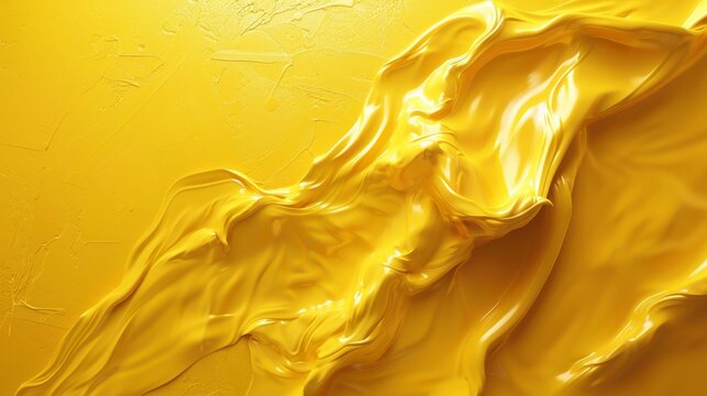 Abstract flowing bright yellow paint, glossy and textured, over a flat yellow surface