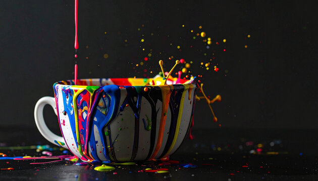 Ceramic cup with frozen moment of vibrant colorful paint splashing over rim. Glossy paint texture
