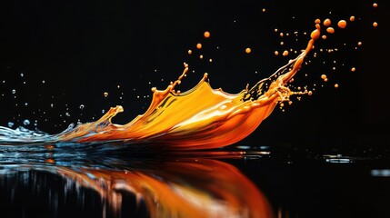 Dynamic Splash of Vibrant Orange Paint Over Calm Water Surface Creating Stunning Visual Contrast Against Black Background