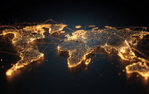 A digital map of the world illuminated with golden lights, representing global connectivity and technology.