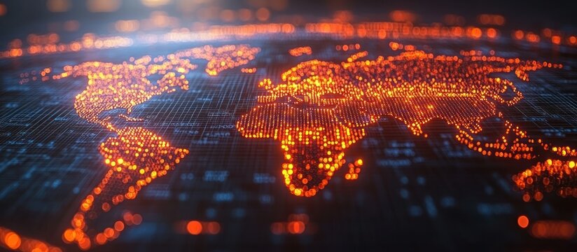 digital representation of global network with interconnected nodes, showcasing data flow and communication across world map. vibrant orange tones create dynamic and engaging visual