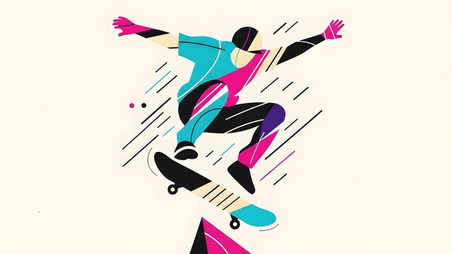 A vibrant, graphic illustration of a skateboarder performing an ollie trick with dynamic lines and geometric shapes in a modern, abstract style.