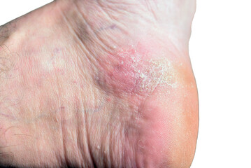 Skin condition with dyshidrotic eczema on the foot against a white background.