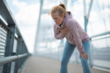 Woman experiencing chest pain while running on bridge