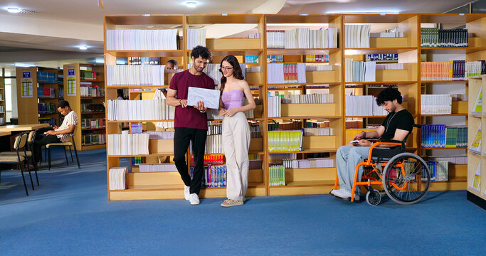Indian Young adult gen z busy guys female male man woman lady use laptop look screen do online new e learning check work campus place. Teen pupil boy sitting on wheel chair hold book read library area
