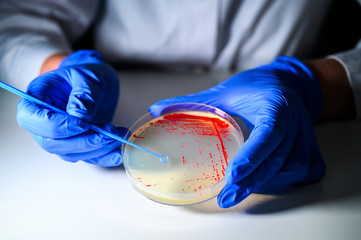 Reasercher picking up colony of a red bacterial culture from agar plate wearing blue gloves in a molecular biology laboratory for the isolation of drug resistant mutants