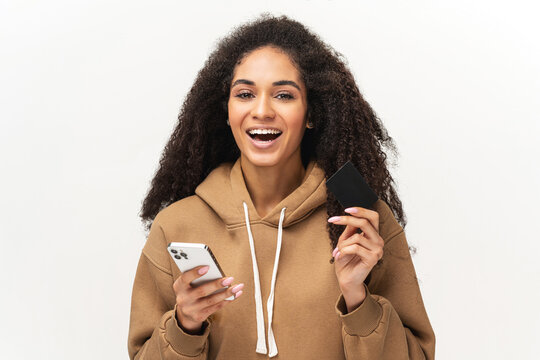 E-banking and ecommerce concept. Smiling multiracial female with Afro hairstyle holding modern smartphone and credit card for online shopping, looking at camera isolated on blu