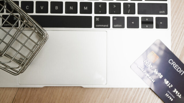 Laptop keyboard with shopping cart and credit card symbolizes online shopping and e commerce convenience. image highlights digital transactions and modern consumer habits
