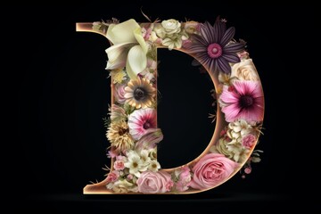 Floral letter D formed with pink and peach roses and ranunculus flowers alphabet flower arrangement