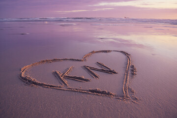 K and N Initials Inside a Hand-Drawn Heart on Golden Wet Sand with Gentle Sunset Reflection – perfect for engagement announcements