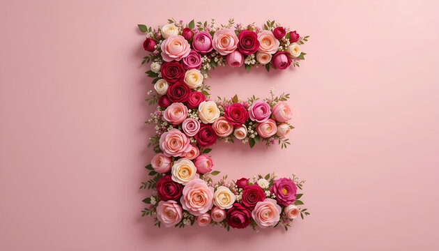 Capital letter E made of a bouquet of pink and red roses on a pastel background