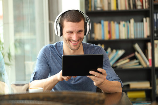 Black headphones are resting on a stack of antique books on a wooden surface inside a library