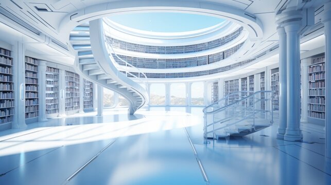 Elegant interior of fictional library with grand windows