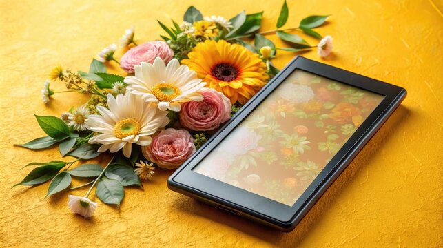 Contemporary e reader with floral decor on golden surface