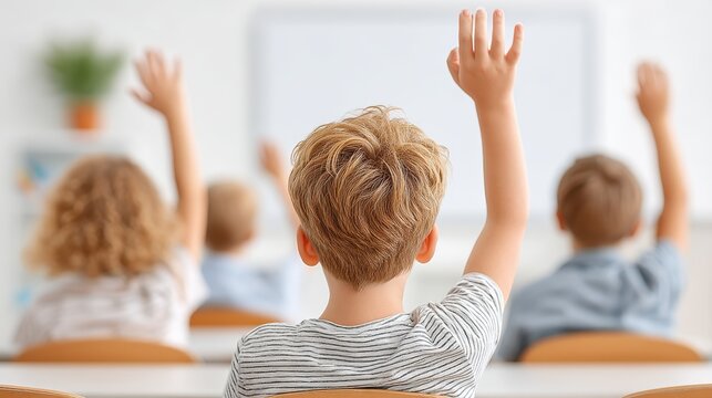 Little boy raising his hand in classroom, eager to participate in learning activity