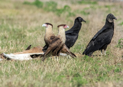 Two crested caracaras share a dead deer carcass with a pair of Black Vultures roadside in south florida.