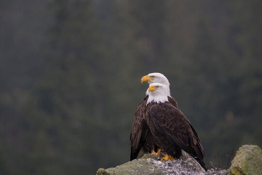 Bald Eagle (Haliaeetus leucocephalus) adult pair, male above female perched in a pine tree branch
