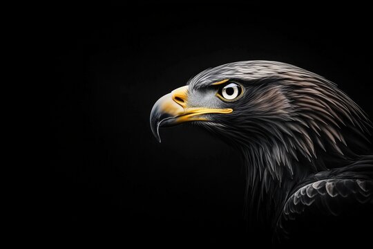 Side profile portrait of a Bald eagle (Haliaeetus leucocephalus) on a black background; Nebraska, United States of America