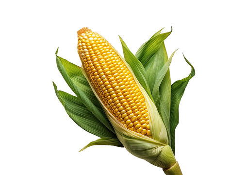 Ripe yellow corn kernels glistening on fresh green husked ear, isolated against transparent background