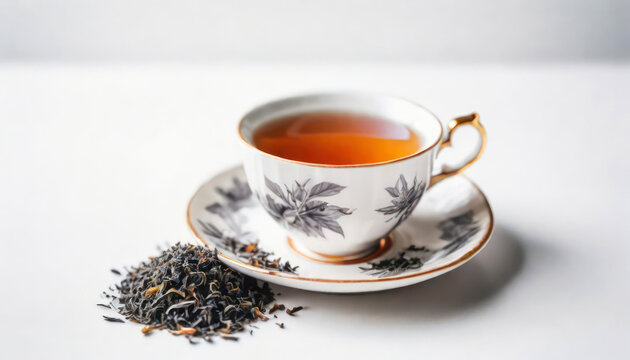 Earl Grey tea in a white cup on a saucer on a white background