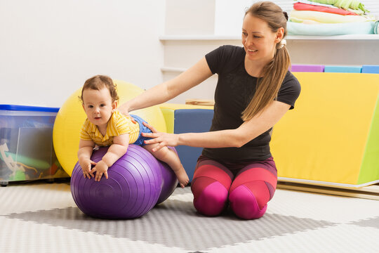 Smiling toddler using supportive equipment in a bright therapy room, promoting early intervention and assistance