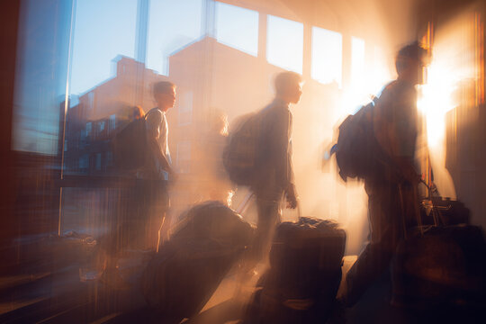 Freshmen carrying luggage enter campus building during orientation in early autumn afternoon light