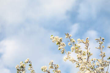 White blossom flowers on tree in early spring with blue sky background