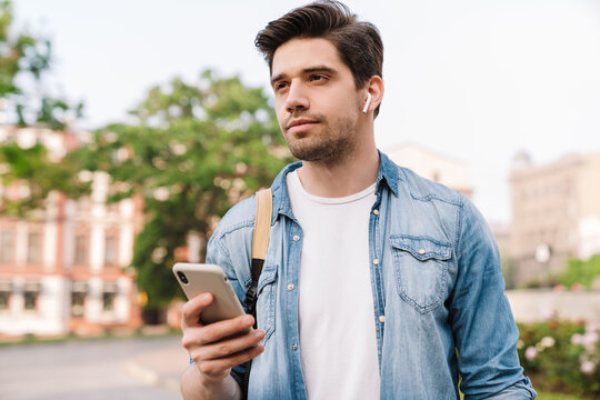 Photo of focused man with earphone using cellphone while walking
