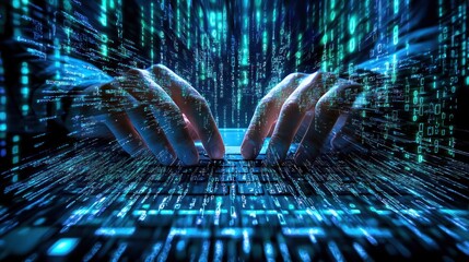 A digital representation of a globe surrounded by glowing data streams and binary code.