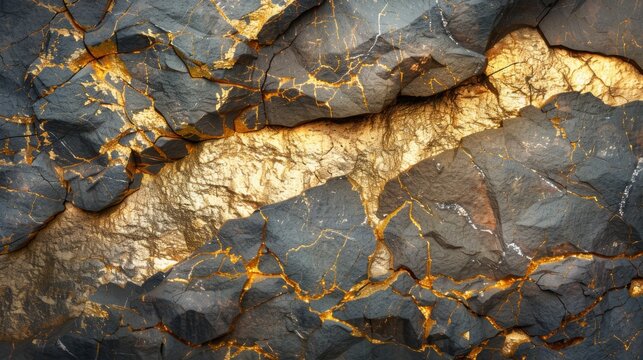 A close up look at a striking rock formation features dark stones with shimmering golden mineral veins, highlighting the natural beauty and complexity of geological structures.