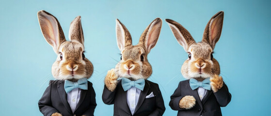 easter celebration holiday greeting card, three bunnies rabbits with suits, isolated on pastel blue background