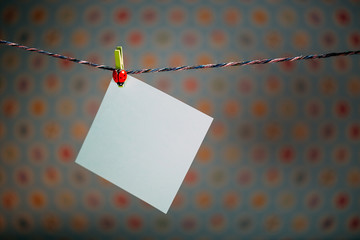 some colorful easter eggs hanging on some line and a blank card on the wire