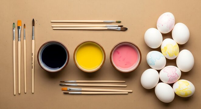 Overhead view of Easter egg decorating supplies including fresh eggs, colorful dyes, and various brushes arranged on a warm background for a fun craft