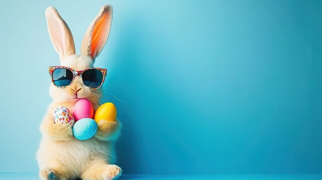 Fashion-Forward Easter Rabbit with Mirrored Sunglasses Displaying Patterned Eggs on Cobalt Blue Canvas. Contemporary Design with Text Zone for Slogans, Suitable for Lifestyle Blog Graphics, Email Mar