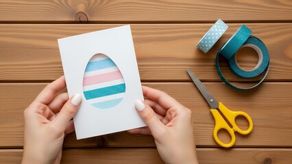 A craft project with Easter-themed stamps, paper cutouts, and ink pads, showing a partially completed greeting card