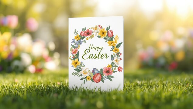 Easter greeting card decorated with flowers and congratulatory text, spring holiday