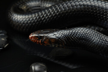 Dangerous black snake coiled in dark environment