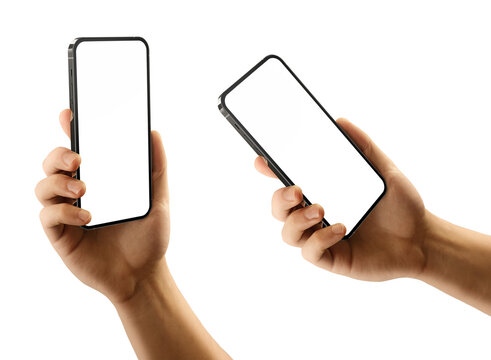Man's hand holding the black smartphone with a transparent blank screen isolated transparent background - PNG format - easy replacement of background and device screen