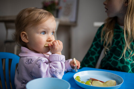 Charming happy little baby boy eating first food green grape at the bright kitchen at home