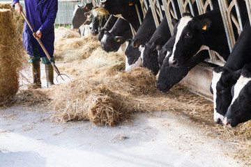 Black an white milk cows in a stable eating organic hay at dairy farm