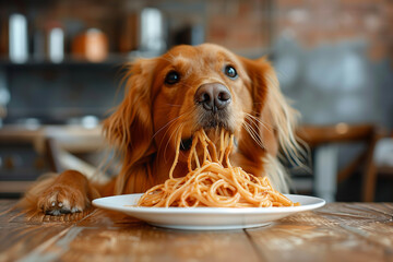 Dog eats delicious spaghetti in the kitchen.
